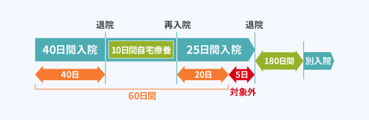 (例)40日間入院した後に退院して10日間自宅に戻り、その後、再度同じ原因で25日間入院した場合